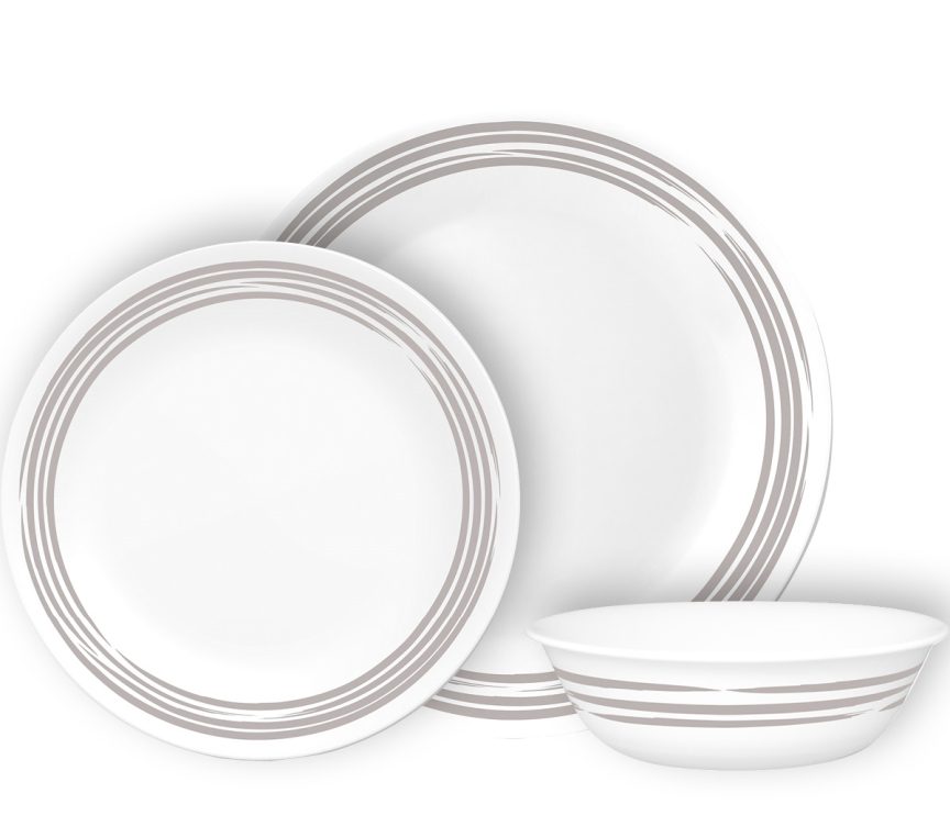 דגם בראשד סילבר מאופיין במשיכות מכחול בצבע אפור-כסף המקיפות את שפת הצלחות על פני הלבן הבוהק.