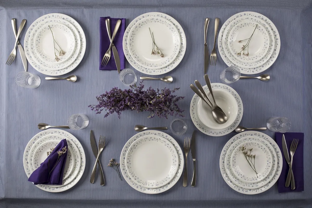 סט הצלחות של קורל מדגם לילך בלאש מעוטר בפרחי לילך סגולים עדינים. דגם זה מאופיין בסגנון וינטאג', עיטורי הפרחים נישאים בעדינות רבה על גבי הרקע הלבן מקשטים כל שולחן ומתאימים הן לשימוש יומיומי והן לאירוח.
