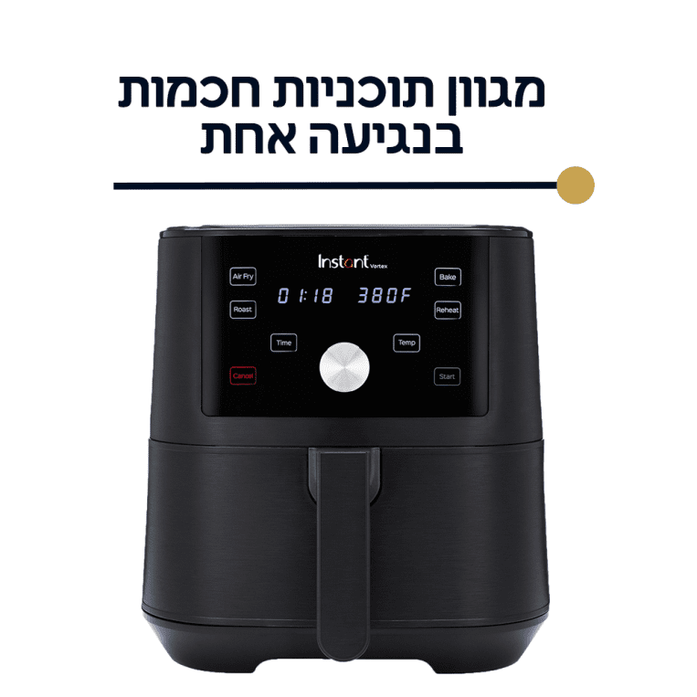 זמן וטמפרטורה הניתנים להתאמה בקלות ומגוון תוכניות חכמות בנגיעה אחת: לטגן באוויר, לצלות, לאפות ולחמם מחדש בלחיצת כפתור ולקבל תוצאות פריכות ונימוחות בכל פעם. מהיר, תכליתי ונוח, הכינו את המאכלים האהובים עליכם עם פחות שמן וללא בלגן במטבח.